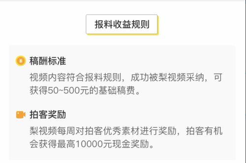 你知道吗?最近在网络上掀起了一股梨视频爆料赚钱的热潮!这可不是什么空穴来风,而是实实在在的互联网现象。今天,就让我带你一探究竟,看看这梨视频究竟是如何成为赚钱利器的!